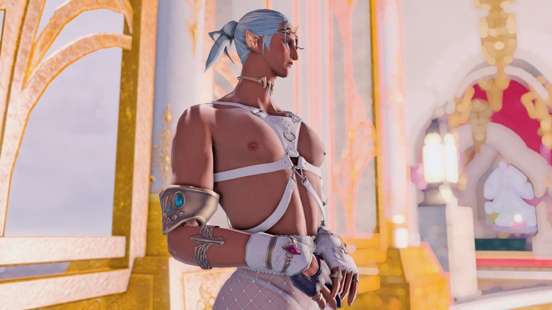 A cheeky Elezen likely to dismiss himself as 'just another airhead trick,' Gandy is - while that too - a kind soul with a love of meeting interesting people. He's worked the streets a long time, and sees himself as a bit of an old-fashioned flavor at most modern clubs, but with all that time comes experience, patience, and professionalism befitting a Pearl of the Lane. He's always willing to share stories about his life - an ordained priest and sex worker isn't a particularly common combination, he knows - but his true interest lies in listening, drawing men to open up to him in the bedroom and out.